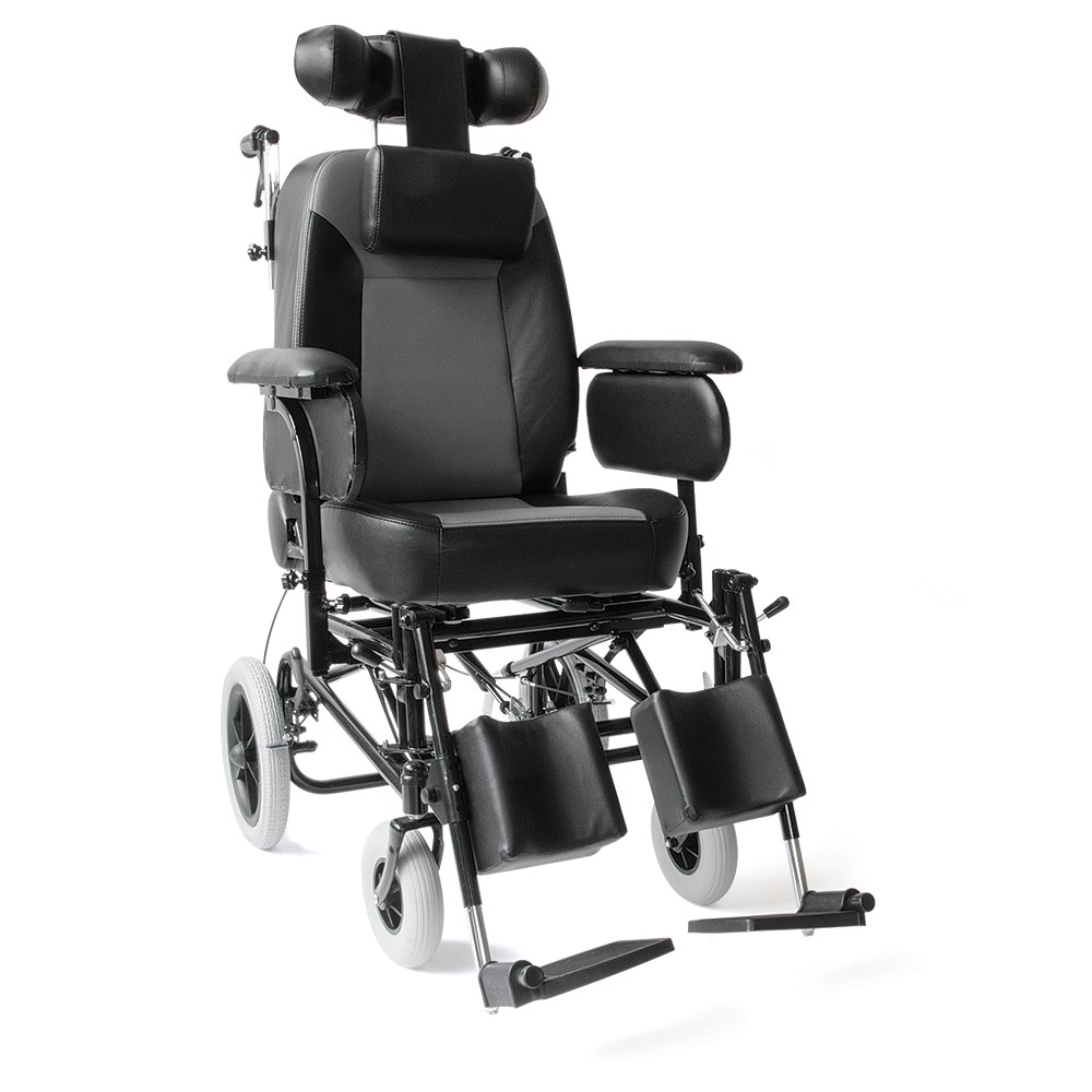 Μεταλλικός σκελετός ηλεκτροστατικής βαφής (“powder coating”). Ανακλινόµενη πλάτη, ρυθµιζόµενη και προσθαφαιρούµενη βάση στήριξης κεφαλής. Ανατοµικό µαξιλάρι αυχένα. Ρυθµιζόµενη γωνία (“tilt”) καθίσµατος και υποβραχιόνια ρυθµιζόµενου ύψους. Aνακλινόµενα και προσθαφαιρούµενα υποπόδια µε µαξιλαράκια στήριξης της γάµπας. Φρένα συνοδού. Mοχλός ρύθµισης θέσης καθίσµατος. Ροδάκια “Antitip”.